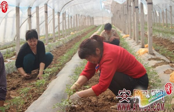 安阳县韩陵镇党委、镇政府在高效农业上大做文章,通过土地流转、调整产业结构、创新种植模式,进一步拓展高效农业增值、增效空间,鼓起农民钱袋子。图为4月8日,韩陵镇梨园村农民正在西红柿种植基地管理西红柿苗。(张 攀 李昌奇 摄)