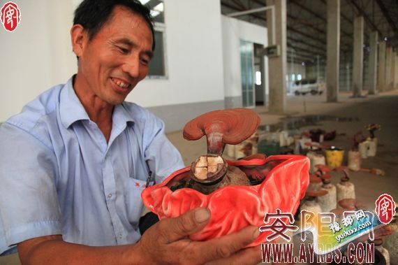 ?位于崔家桥镇的安阳县清河灵芝培育基地目前已培育出帝灵芝、赤灵芝、紫灵芝等10多个品种。该基地预计8月向市场推出盆景灵芝1万盆,让消费者将灵芝养在自己家里,既保留了它的药用价值,又增加了观赏价值。图为7月27日,该基地管理人员在展示制作好的盆景灵芝。 (贾海平?摄)