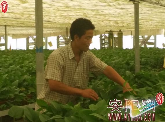 ?安阳县洪河屯乡鸡毛上天高效农业专业合作社流转土地200多亩,建设了6栋连体日光温室,以培育绿萝、凤梨等绿色植物为主,并自行培育出了荷叶碧玉等新品种,颇受消费者青睐。图为8月17日,该合作社负责人史党臣正在管理绿萝。(记者?金红梅??摄)
