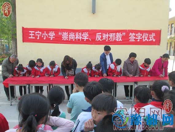 ??? 4月11日上午,安阳县韩陵镇王宁小学师生举行“崇尚科学、反对邪教”签字仪式。该校校长及学生代表进行发言,全校师生纷纷签字。通过这次活动,师生们深刻地认识到“崇尚科学、反对邪教”的重要性。(李玉芹 摄)