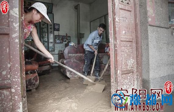村民正在清理家中涌进的淤泥
