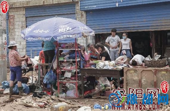 商贩正在清理被淹货物
