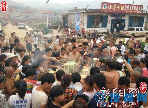 泉门村的受灾群众在临时救助点吃大锅午餐