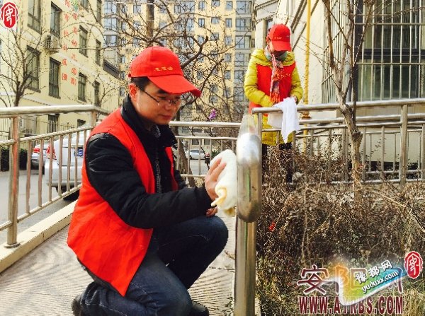 志愿者在擦洗护栏。(记者 王都君 摄)