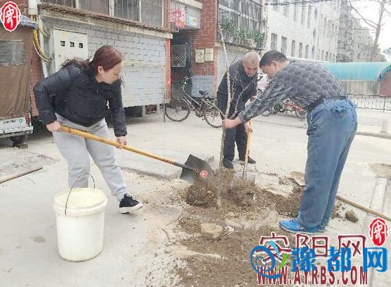 图为王艳平(左一)在居民小区帮忙种植树木