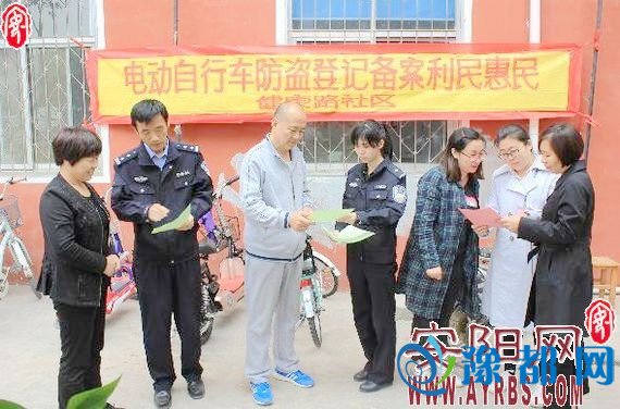 《北关公安分局联手健康路社区开展电动自行车防盗登记备案宣传》由河南新闻网-豫都网提供,转载请注明出处:http://anyang.yuduxx.com/beiguan/595251.html,谢谢合作!