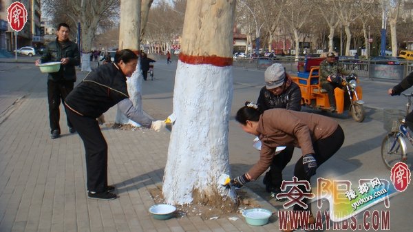 3月9日,文峰区西关街道办事处安运社区开展了“美化家园,人人有责”志愿活动,志愿者来到彰德路分包路段粉刷行道树,清理卫生死角。(记者 侯沛丽 摄)