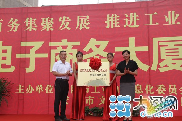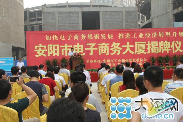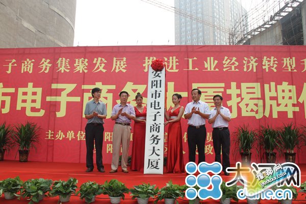 揭牌仪式上,工信部王建伟处长,安阳市委常委、副市长张曼如共同为“国家工业电子商务区域试点”揭牌,河南省工信委副主任孟西林、市工信委主任侯合柱、安阳市商务局局长牛瑞庆、文峰区区长杜建勋共同为安阳市电子商务大厦揭牌。