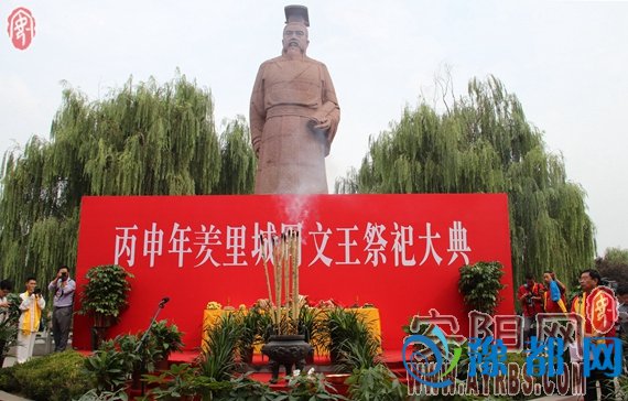 ????上午9时,开幕式在汤阴羑里城周易博物馆门前大广场上举行,来自海峡两岸及国内外的易学专家、学者2000余人出席了开幕式。9时30分许,随着吉祥锣声鸣起,此次盛会拉开了帷幕。随后,与会嘉宾来到羑里城内的周文王塑像前举行了“丙申年祭祀周文王大典”,在庄严肃穆的气氛中,来自社会各界的周易文化传承人满怀对周文王的敬仰之情,向文王塑像行鞠躬礼,并依次上前净手焚香,敬献花篮。????