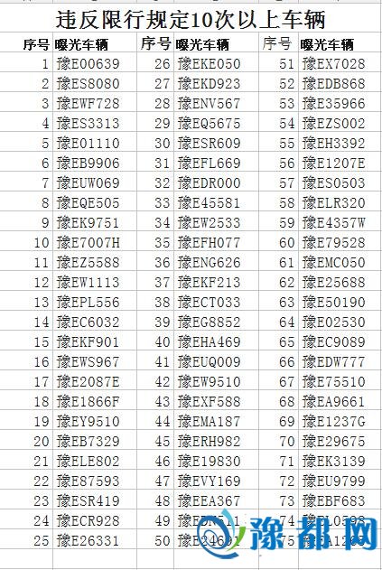 ????为积极响应我市“蓝天工程”建设,按照市政府大气污染防治蓝天工程指挥部指令,11月5日至12月31日,我市主城区实施机动车单双号限行。此项交通管制工作得到了广大人民群众的理解和支持,均能按照限行规定上路行驶,但仍有一部分驾驶员朋友不遵守限行规定,甚至多次违章。在此,安阳交警公布一批违反限行规定10次以上车辆信息,希望广大驾驶员朋友以此为戒,遵守交通法规,文明出行。