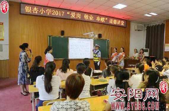 ??? 在庆祝中国共产党建党96周年之际,6月28日,高新区银杏小学举办以“爱岗、敬业、奉献”为主题的道德讲堂,通过学模范、诵经典、讲故事、谈感悟等7个环节,让大家认识到爱岗敬业行胜于言。图为师生通过表演形式,再现上街维护交通的场景。(记者 杨凌高 摄)