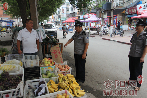 6月30日,市城市管理局执法人员在二果园规范商户经营行为。 (钱思远 摄)