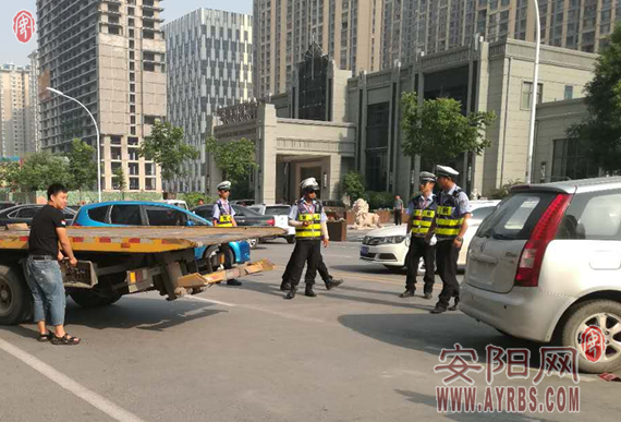 7月3日,交警在德隆街东段对违法停车进行现场清理。 (记者 苏迅 摄)