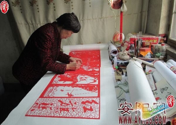 在林州市,有一位名叫于金花的民间剪纸艺人,她把红旗渠当作自己的创作源泉,通过创作剪纸作品,宣传红旗渠,传承红旗渠精神。今年春节前后,年近古稀的于金花老人用灵巧的双手创作出长数十米的红旗渠长卷作品,向红旗渠通水50周年献礼。