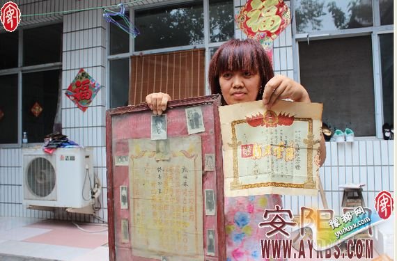 连文娟展示张双林的立功喜报和张林山的光荣纪念证