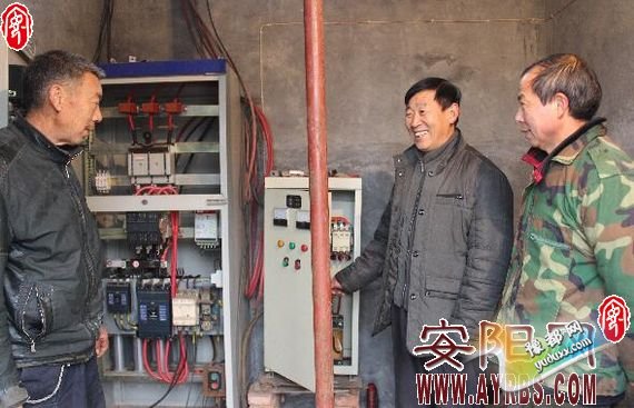 ??????????????? ?图为李启生(中)在查看村里机井的配电设施