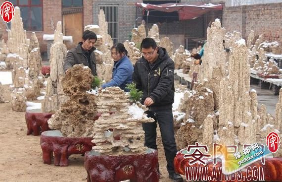 ????12月3日,记者在王四的公司看到,里面用石头做成的盆景和假山可谓千姿百态,气象万千。谈到产品的销售,王四乐观地说:“安阳、新乡、洛阳、濮阳、青岛等城市的好多用户都来订货,今年销售额130多万元。产品销售最远北到沈阳,南到长沙。我们有时还外出做工程,去过山东聊城和青岛的几家大酒店,最近这几天在安阳县水冶镇一家敬老院做假山,现在感觉人手不够,忙不过来。”