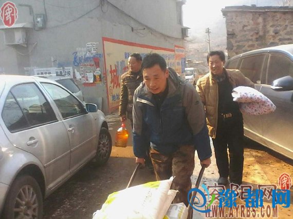 董海涛(前)给村里困难户送慰问品。(资料图)