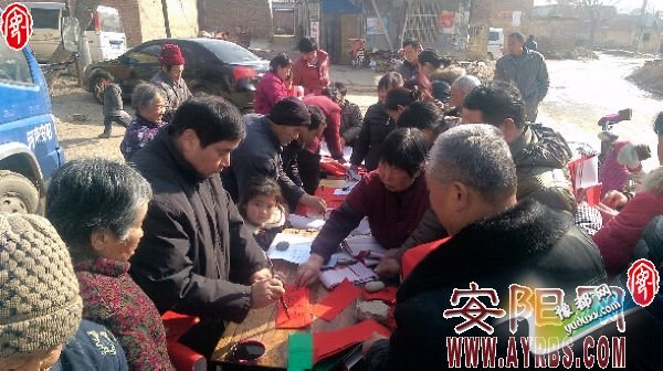 为进一步做好定点帮扶工作,2月4日,市市场发展服务中心的干部职工来到龙安区马投涧镇高白塔村,义务为群众写春联,受到大家的好评。(记者 王亚南 摄)