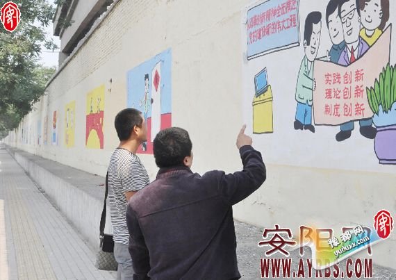 龙安区组织人员在烟厂路南段墙面上绘制了长千米的“文明龙安画卷”,建成精神文明宣传新阵地。该画卷由中国梦、社会主义核心价值观、新二十四孝等6个篇章近150块绘图组成。图为9月17日,群众在观看画卷。(记者 姚庆云 摄)