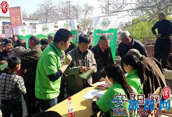 图为河南年年想肥业有限公司工作人员正在向农户宣传测土配方施肥的好处。