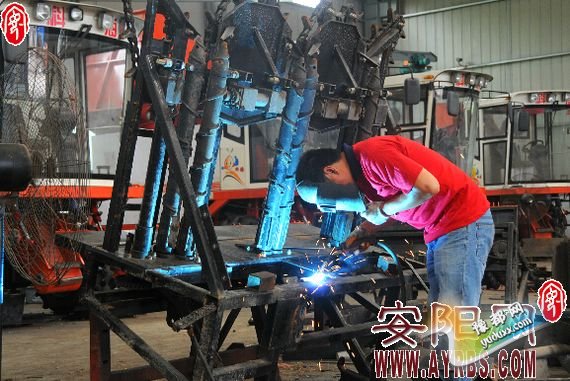 ?9月1日,内黄县科海农机有限公司的员工正在加紧生产玉米收获机。“三秋”将至,该县各农机生产企业和农机销售市场上的玉米收获机、小麦播种机等农机具俏销,奏响了“三秋”生产的序曲。(刘??超?? 摄)