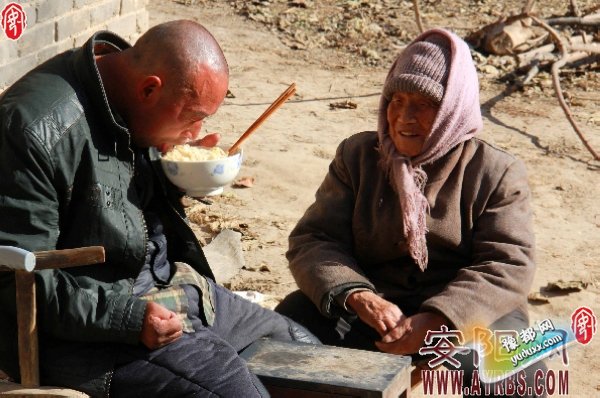 不知不觉时间已接近中午,老人开始为儿子准备午饭。老人慢慢走回屋里,打开火炉,取了个小碗,将鸡蛋打入碗中,翻搅几下,倒入烧热的油锅中,放入切好的白菜丝……随后,老人拄着木棍,艰难地走到另外一个房间取面条,走几步歇一下,每一步都显得那么沉重和艰难。面条煮好后,老人将热腾腾的面条端到了儿子身边。看到儿子将饭菜一口一口吃下去,老人脸上露出了幸福的笑容。我们劝老人也吃点儿。“先让他吃饱了,我还不饿,一会儿我随便吃点儿就行。”老人说完,目光又转到了正在吃饭的儿子身上。做饭、喂饭,这样平凡的画面每一天都这样上演着。