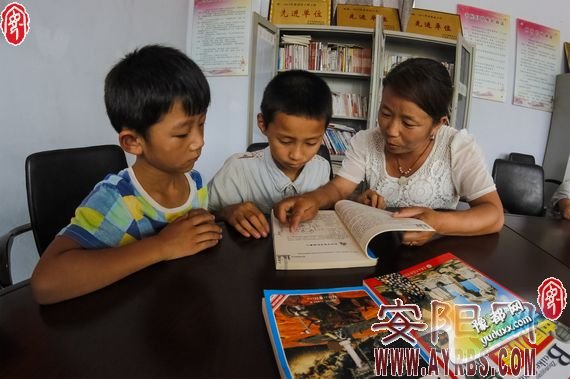 ?为丰富农村留守儿童的暑假生活,汤阴县298个行政村农家书屋全部面向学生开放,并组织大学生“村官”到农家书屋为学生答疑解惑。图为在汤阴县伏道镇小贺屯村农家书屋内,大学生“村官”在辅导孩子学习。(王鹏飞 摄)