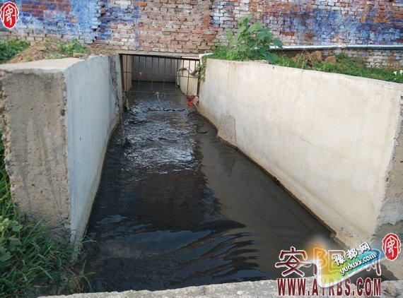 汤阴污水处理厂墙外的一处排水口向外排放的黑水。