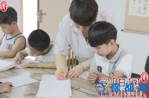 ??? 暑假期间,汤阴县文化馆免费开展书法知识讲座、书法培训等活动,丰富了该县中小学生的暑期生活,为他们搭建起更好的学习平台。图为8月1日,该县文化馆教师正在对学生进行硬笔书法指导。(付宇 摄)