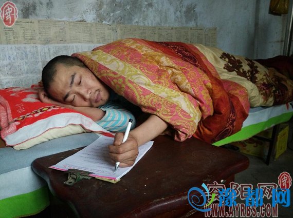 ????在房间内,郭永卫斜躺在床上,面朝里,身上盖着两床被子,正在用指关节翻阅手机,他头顶的桌子上放着一沓稿纸和书籍。为了方便与记者沟通,母亲牛保芹帮他翻了翻身子。“今年是我躺在床上的第10个年头了。”郭永卫说,2006年,他在福建打工,一天,在工作中他被电流击倒,失去意识的他摔下了人字梯,当即昏迷,工友赶紧将他送到医院。醒来时,他的颈椎关节骨折,胸部以下完全失去了知觉,从此高位截瘫。