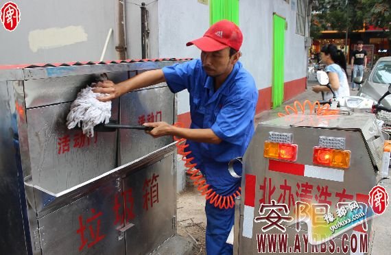 ?在“创卫”复审工作中,文峰区北大街街道办事处在道路保洁上不断提高标准,既做到垃圾不落地,又保证垃圾箱定期清洗。图为8月19日,街道保洁人员清洗垃圾箱。(记者 邱?峰?摄)