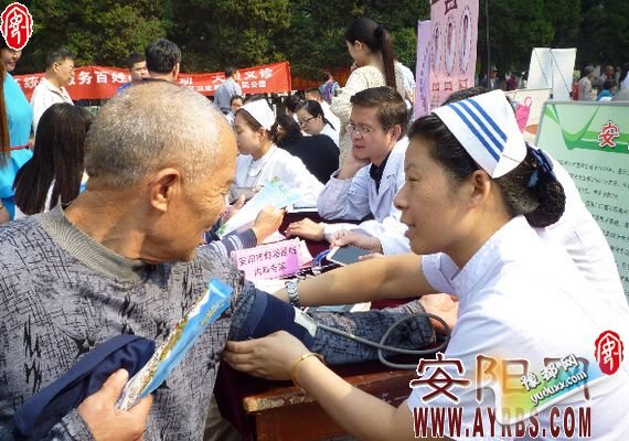 ?昨天,文峰区在市人民公园举办“服务百姓健康行动”大型义诊活动。辖区内10多家卫生医疗机构的医务人员免费为群众测血糖、量血压,现场宣传慢性病防治知识等,2000余名市民享受了免费义诊。(记者??姚庆云 摄)