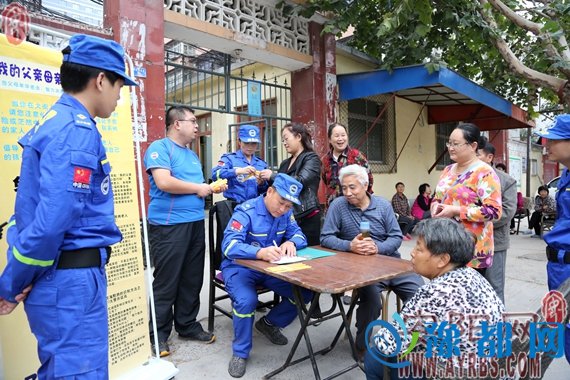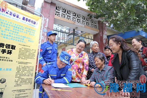????2016年10月7日下午,河南安阳蓝天救援队志愿者走进文峰区紫薇街道晨光社区,向辖区楼院身体欠佳和患有痴呆症的老人宣传、发放“黄手环”,受到社区干部和居民群众的称赞。